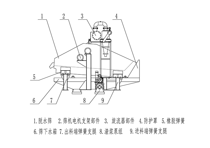 該設備一般直接安裝于洗砂機后部,設備上的脫水篩對洗砂機的成品物料進行再一步脫水,設備上的回收系統則對洗砂機排出的廢料進行再回收,充分解決了洗砂機的弊端(如:成品含水量大、含泥量大、粉塵多、雜質難以清除等),大大提高了成品的品質。旋流器將洗砂廢水中的細砂與水分離后,將濃度被提升至60-70%的細砂排入脫水篩表面進行脫水,實現細砂的脫水回收。