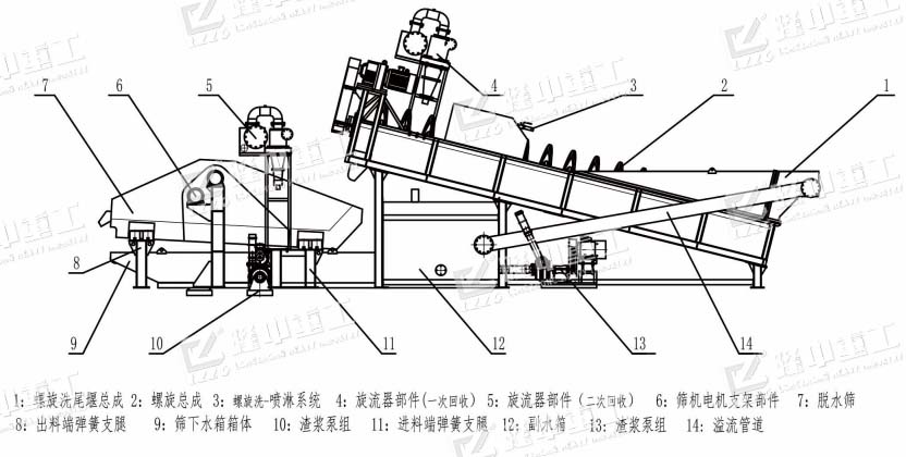 組成:螺旋洗砂裝置,溢流裝置、反水裝置,尾礦干排裝置,分離回收裝置,儲(chǔ)水槽,水泵,電機(jī),減速機(jī)。